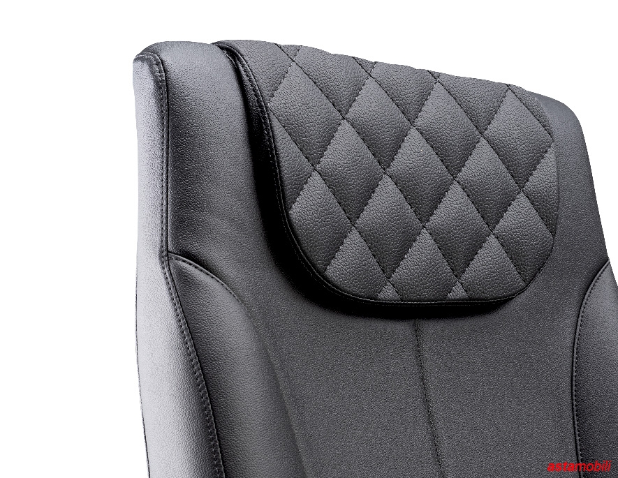 ESTOFAMENTO E APOIO DE CABEÇA - Estofamento que forma o apoio de cabeça, com detalhes em costuras que formam losangos.